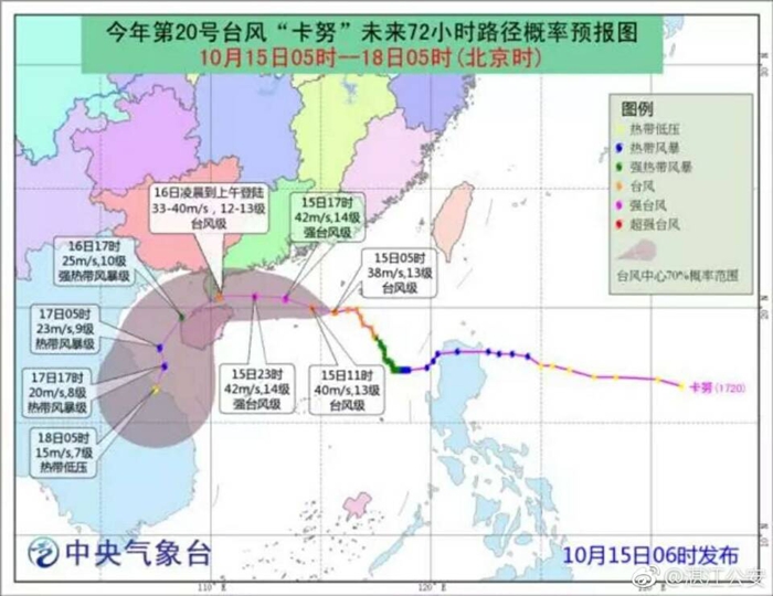 台风“卡努”将于10月15日夜间到16日早晨在三亚到湛江沿海地区登陆,很有可能正面袭击雷州半岛,将对湛江全市造成狂风暴雨大潮等影响,请密切留意台风动向,做好应急和防台风准备工作,确保安全。
