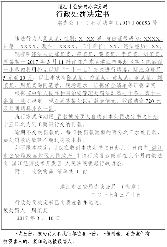 周某某赌博案行政处罚决定书