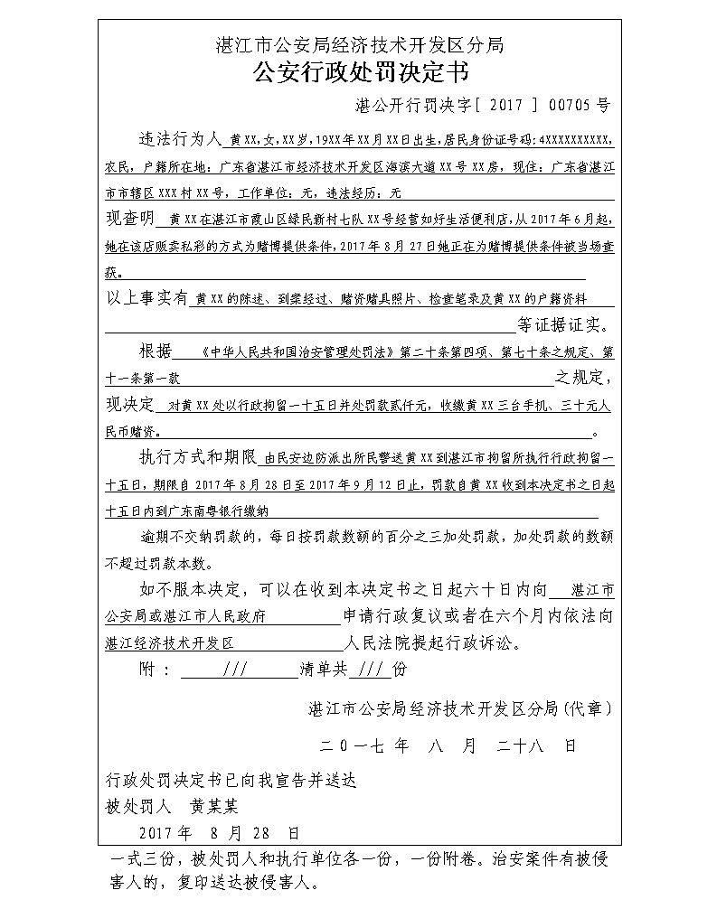 黄某某为赌博提供条件行政处罚决定书